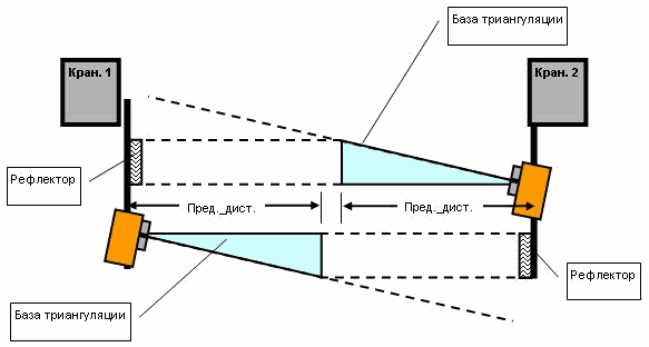 Принцип работы системы состоит в том, что при приближении кранов друг к другу на критическую дистанцию отражатель, установленный на противоположном кране, попадает в поле зрения оптического датчика, который вырабатывает сигнал тревоги , или подает команду на остановку кранов. Применяются также датчики с двумя «лучами», которые варабатывают на определенной дистанции сигнал тревоги, а на предельной дистанции дают команду на выключение двигателей.