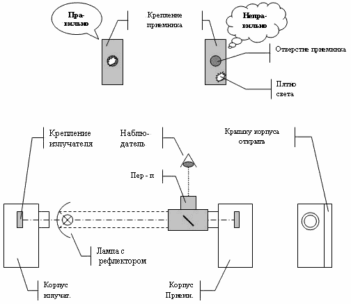 Юстировка прибора типа T с двумя активными частями при помощи юстировочного перископа. Корпус приемника поворачивается до тех пор, пока пятно света не совпадет с отверстием приемника