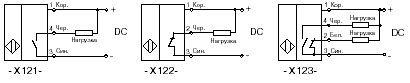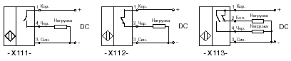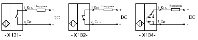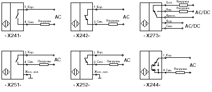 Ниже приводятся возможные схемы подключения бесконтактных выключателей "Сенсор" с различными коммутационными функциями. Под каждой схемой приведен фрагмент обозначения изделия, относящийся к подключению и коммутационной функции. Конкретная схема подключения данного типоразмера ВБ указана на этикетке изделия.