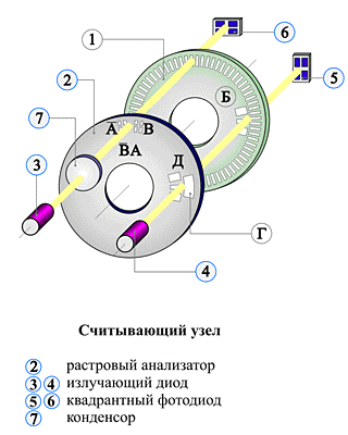 Конструктивно эти задачи решает инкрементный узел преобразователя перемещений. Первую из них решает механическая часть этого узла, обеспечивая необходимую точность растрового сопряжения лимба и анализатора, а также соосность последних по отношению к оси вращения вала. Вторую — реализуют осветители, фотоприемники и плата электрической схемы выделения и обработки информации о перемещении. Излучающий диод 3, конденсор 7, формирующий параллельный пучок лучей осветителя, окна А, А, В, В анализатора и фотоприемник 6 образуют так называемый канал считывания. Требование повышенной точности преобразователей перемещений диктует применение двух или четырех диаметрально расположенных каналов считывания.