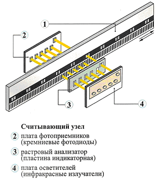Конструктивно первую задачу решает каретка, жестко связанная с анализатором, находящаяся через подшипники качения в постоянном контакте со шкалой, что делает возможным относительное перемещение шкалы и анализатора. Вторую задачу реализуют платы фотоприемников 2 и осветителей 4, установленные на ту же каретку, и плата электрической схемы выделения и обработки информации о перемещении, расположенная в корпусе считывающей головки. Плата осветителей содержит шесть излучающих диодов, обеспечивающих засветку соответствующих окон анализатора, и пространственно согласованных с ними приемных площадок шести фотодиодов платы 2.