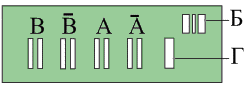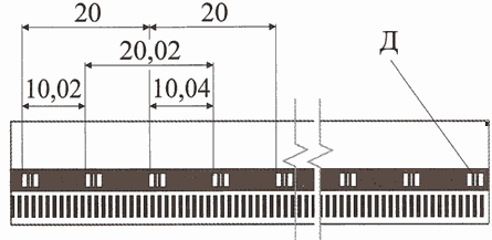 Растровый анализатор содержит 4 окна А, А, В, В инкрементного считывания и окно референтной метки Б. Названные выше 4 окна позиционно согласованы с дорожкой регулярного растра шкалы. Шаги растров в окнах равны шагам регулярного растра шкалы (20 мкм или 40 мкм). При этом в каждой паре окон растры смещены друг относительно друга на величину, равную половине их шага, а взаимный пространственный сдвиг растров между парами окон составляет четверть шага растров. Последовательно с растровыми окнами расположено прозрачное окно Г. Референтная метка Б позиционно согласована с дорожкой референтных меток шкалы.