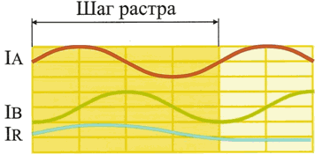 Построенный таким образом канал считывания информации позволяет сформировать два ортогональных периодических сигнала IА И IВ, исключив из них постоянную составляющую. Взаимный характер изменения указанных сигналов дает возможность определить направление перемещения, а число их периодов при данном перемещении его величину. Специальные методы обработки сигналов IA и IВ позволяют обеспечить контроль перемещения с дискретностью, много меньшей периода регулярного растра.
